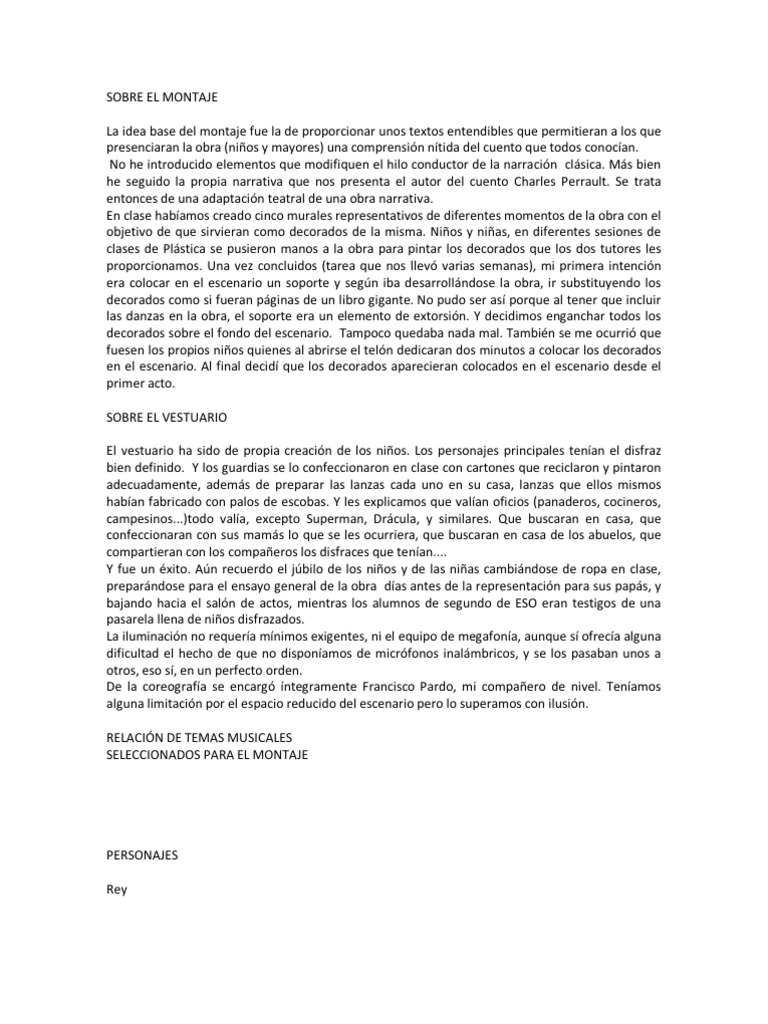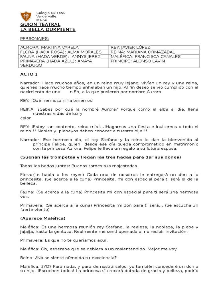 Ver másEL CALLEJÓN DEL BESO. Carlos un humilde obrero de 21 años de edad y Carmen una una bella joven de. Oímos la voz de Bella BELLA-. No olvidemos que los bosques son bonitos y que los zapatos se ponen en los pies. OBRA DE TEATRO -El CALLEJÓN DEL BESO. La bella durmiente del bosque es un cuento de hadas nacido de la tradición oral. En una tierra lejana hace mucho tiempo vivía un rey y su reina. Guion teatral la bella durmiente personajes. Alma morales fauna hada verde.