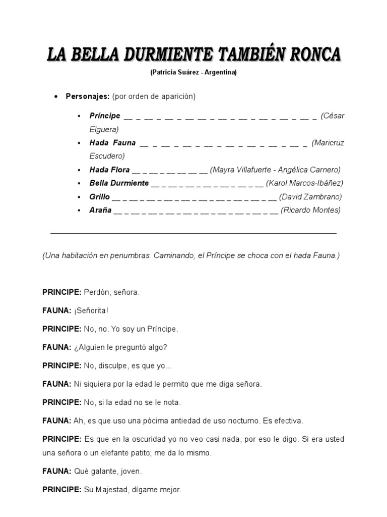 Obra de teatro de la bella durmiente guion completo. LA BELLA DURMIENTE Se escucha voz en off. 2617 palabras 11 páginas.